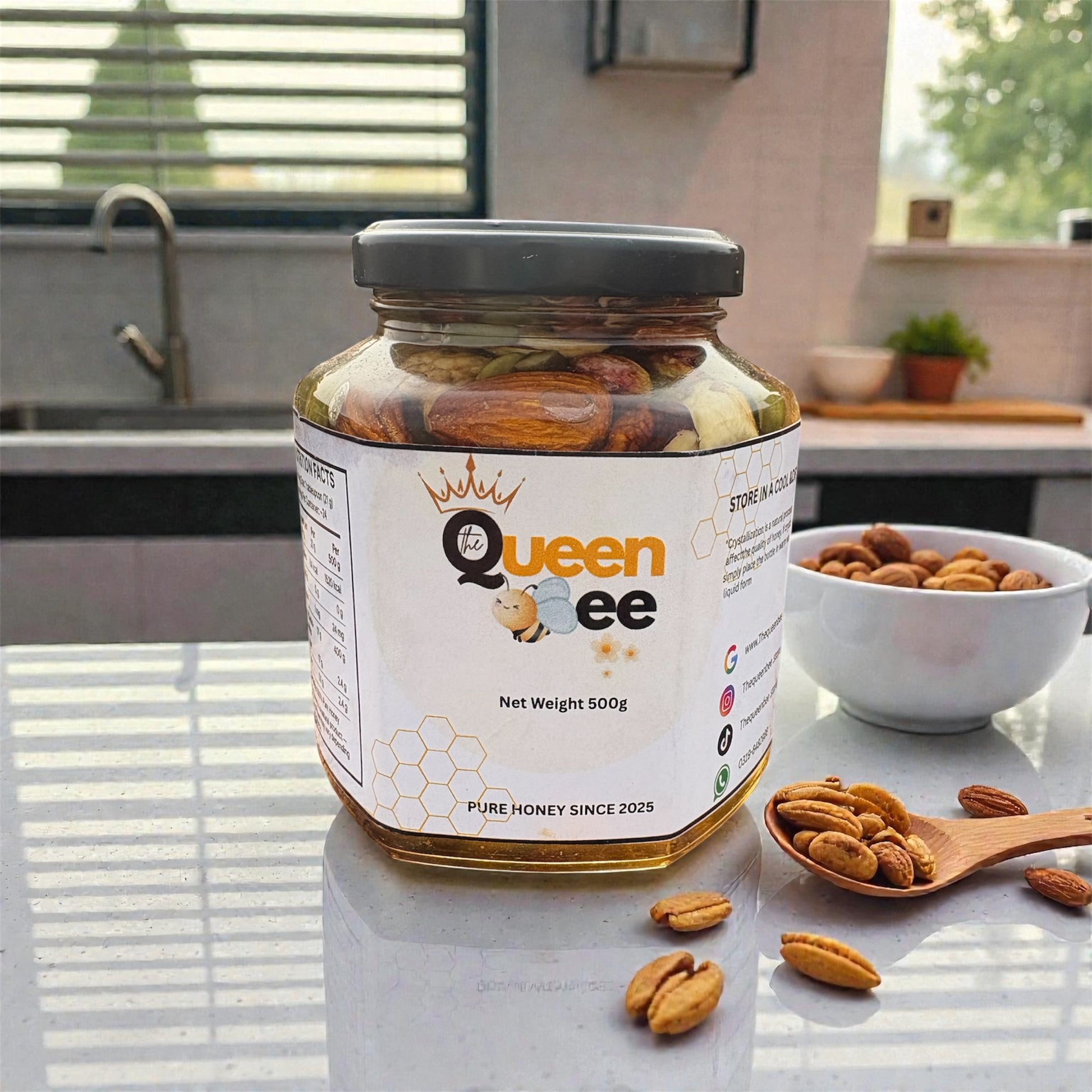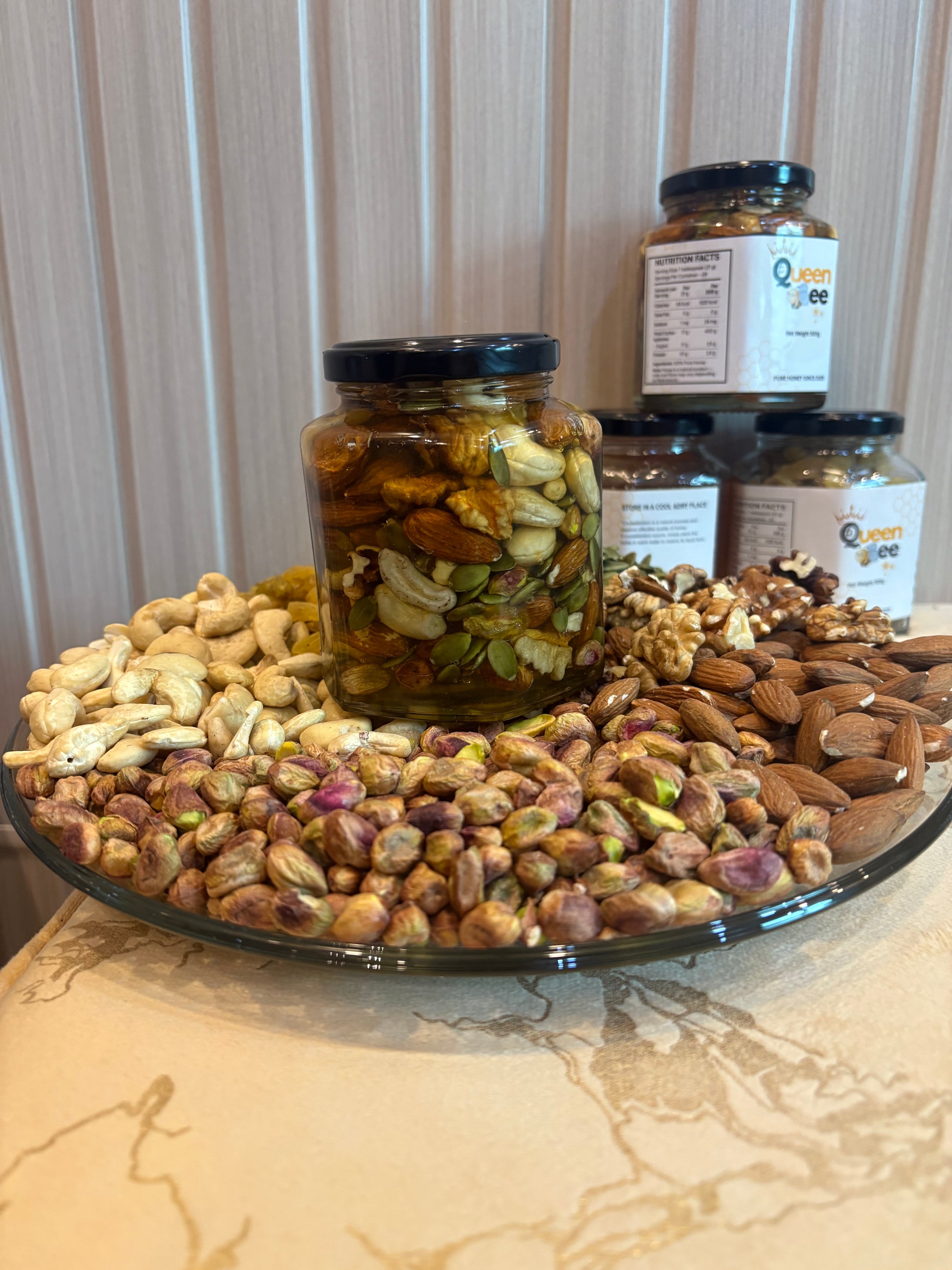 Premium Nuts & Honey is a nutritious combination of premium almonds, cashews, pistachios, walnuts, pumpkin seeds, and pure natural honey. Each ingredient is carefully chosen to ensure the best quality and taste. This powerful mix provides essential nutrients, healthy fats, and antioxidants that support a healthy lifestyle. It is an excellent choice for boosting energy, improving immunity, and maintaining overall health. Enjoy it daily as a healthy snack or add it to your breakfast for extra nutrition.